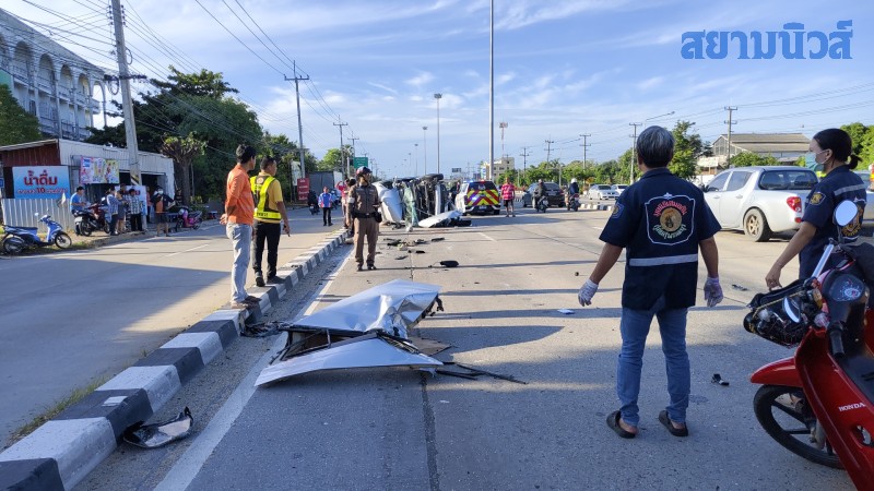 Home ข่าว ข่าวสังคม เศร้าสลด! รถบรรทุกเลี้ยวยูเทิร์นตัดหน้า รถตู้พาคนป่วยส่งรพ. พุ่งชนเต็มแรง