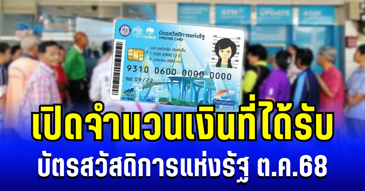 กรมบัญชีกลางอัปเดตสวัสดิการแห่งรัฐ เดือนตุลาคม 2568 โดยนางสาวทิวาพร ผาสุข รองอธิบดีกรมบัญชีกลาง ในฐานะโฆษกกรมบัญชีกลาง เปิดเผยว่า โครงการลงทะเบียนเพื่อสวัสดิการแห่งรัฐ ปี 2565 ผู้มีสิทธิสามารถใช้สิทธิผ่านบัตรประจำตัวประชาชนแบบสมาร์ทการ์ด ซึ่งในเดือนตุลาคม 2568 จะได้รับสิทธิ ดังนี้