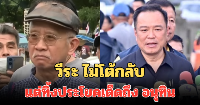 ส่วนที่ นายอนุทิน ชาญวีรกูล นายกรัฐมนตรี กล่าวถึงตนเองว่า มีปากก็พูดไป ไม่เคยทำประโยชน์ให้กับประเทศชาติ นั้น นายวีระบอกว่า ไม่ขอชี้แจงและไม่โต้กลับนายอนุทิน เพราะตนเองไม่เคยโกงชาติ ไม่เคยขายชาติ พร้อมย้อนถามกลับนายอนุทินว่า กล้าพูดเต็มปากหรือไม่ว่าตลอดชีวิตไม่เคยโกงชาติ ไม่เคยขายชาติ ส่วนตนเองมีแต่ช่วยชาติ