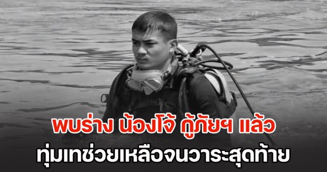 กระทั่ง เจ้าหน้าที่กู้ภัยได้รับแจ้งจากนางบุญมี อรุณบน ชาวบ้านในพื้นที่ว่า พบศพลอยขึ้นมาบริเวณหน้าบ้าน ซึ่งอยู่ห่างจากจุดที่ น้องโจ้ จมหายไปราว 500 เมตร ทีมกู้ภัยจึงรีบนำเรือออกตรวจสอบ และพบร่างชายสวมชุดประดาน้ำสีดำ ลอยคว่ำหน้าอยู่ในน้ำ โดยมีถังออกซิเจนติดอยู่ที่หลัง เจ้าหน้าที่จึงเร่งช่วยกันกู้ร่างขึ้นฝั่ง ก่อนตรวจสอบยืนยันว่า เป็นร่างของนายรุ่งโรจน์