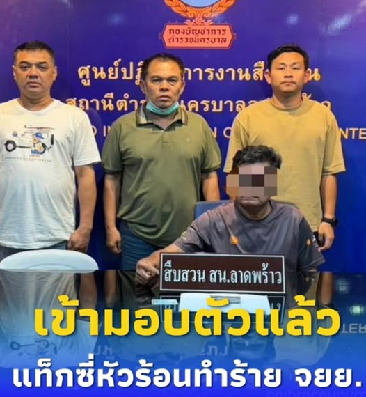 ภายหลังเกิดเหตุดังกล่าว เจ้าหน้าที่ฝ่ายสืบสวนสน.ลาดพร้าว ได้สืบสวนจนทราบว่าคนร้ายคือ นาย สมบัติ ผู้ต้องหารู้ถึงการติดตามจึงแจ้งว่าจะขอเข้ามอบตัว จากการสอบถามให้การรับสารภาพว่าเป็นผู้ขับรถแท็กซี่คันก่อเหตุและได้ใช้อาวุธมีดพับของกลางไล่แทงผู้กล่าวหาจนได้รับบาดเจ็บและขับรถหลบหนีไปจริง และรับว่าเกิดความโมโหที่ผู้กล่าวหาท้าทายและเรียกให้หยุดจึงคุมสติไม่อยู่ก่อนก่อเหตุดังกล่าว พนักงานสอบสวนได้รับตัวและแจ้งข้อหาให้ผู้ต้องหาทราบว่า “ ทำร้ายร่างกายผู้อื่นเป็นเหตุให้ได้รับอันตรายสาหัส ” และจะได้ดำเนินการตามกฎหมายต่อไป