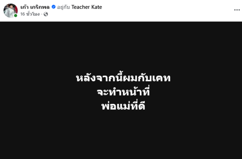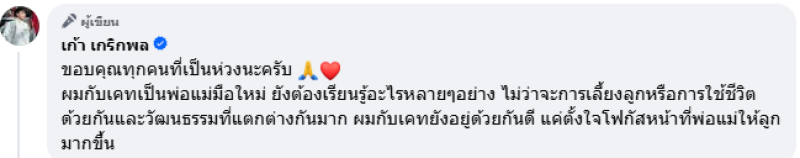 ขอบคุณทุกคนที่เป็นห่วงนะครับ ผมกับเคทเป็นพ่อแม่มือใหม่ ยังต้องเรียนรู้อะไรหลายๆ อย่าง ไม่ว่าจะเป็นการเลี้ยงลูก การใช้ชีวิตด้วยกัน รวมถึงวัฒนธรรมที่แตกต่างกันมาก ผมกับเคทยังอยู่ด้วยกันดี แค่ตั้งใจโฟกัสหน้าที่พ่อแม่ให้ลูกมากขึ้น