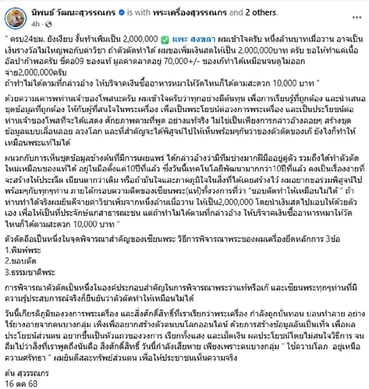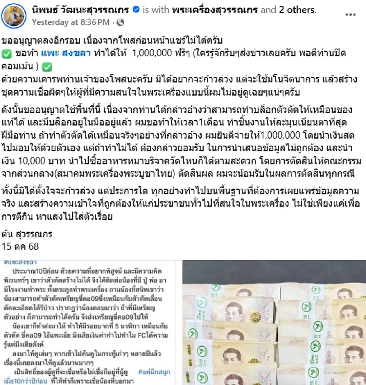 และล่าสุด 16 ต.ค.68 ต้น สุวรรณกร โพสต์จัดเต็มอีกครั้ง ถึง แพะ สงขลา   ครบ24ชม. ยังเงียบ งั้นท้าเพิ่มเป็น 2,000,000  แพะ สงขลา ผมเข้าใจครับ หนึ่งล้านบาทเมื่อวาน อาจเป็นเงินรางวัลไม่ใหญ่พอกับค่าวิชา ถ้าตัวตัดทำได้ ผมขอเพิ่มเงินสดให้เป็น 2,000,000บาท ครับ ขอให้ทำแค่เนื้ออัลปาก้าพอครับ ขี่คอ09 ของแท้ มูลค่าตลาดอยู่ 70,000+/- ของเก๊ทำได้เหมือนจนดูไม่ออกจ่าย2,000,000ครับ