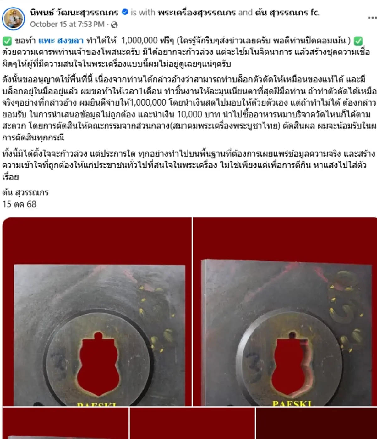 ซึ่งจากโพสต์ดังกล่าวของ แพะ สงขลา ก็ทำให้ นิพนธ์ วัฒนะสุวรรณกร  หรือ  ต้น สุวรรณกร  แห่งพระเครื่องสุวรรณกร ออกมาแสดงความคิดเห็นในอีกมุมหนึ่งทันที พร้อมแชร์โพสต์ดังกล่าวของ แพะ สงขลา ด้วยการขอท้า …ทำได้ให้  1,000,000 ฟรีๆ (ใครรู้จักรีบๆส่งข่าวเลยครับ พอดีท่านปิดคอมเมนต์)