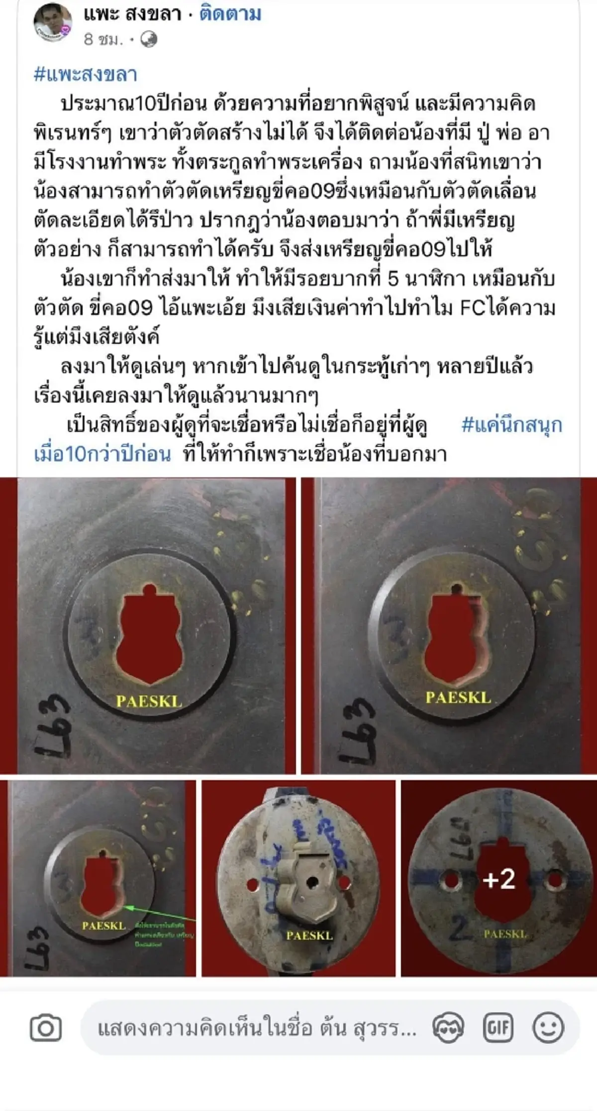 กรณี แพะสงขลา เซียนพระใต้คนดัง ออกมาเคลื่อนไหวถึงการที่ว่า ตัวตัดพระสร้างไม่ได้?? ประมาณ10ปีก่อน ด้วยความที่อยากพิสูจน์ และมีความคิดพิเรนทร์ๆ เขาว่าตัวตัดสร้างไม่ได้ จึงได้ติดต่อน้องที่มี ปู่ พ่อ อา มีโรงงานทำพระ ทั้งตระกูลทำพระเครื่อง ถามน้องที่สนิทเขาว่า น้องสามารถทำตัวตัดเหรียญขี่คอ09ซึ่งเหมือนกับตัวตัดเลื่อนตัดละเอียดได้รึป่าว ปรากฎว่าน้องตอบมาว่า ถ้าพี่มีเหรียญตัวอย่าง ก็สามารถทำได้ครับ จึงส่งเหรียญขี่คอ09ไปให้