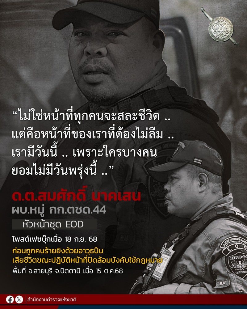 จากกรณี ด.ต.สมศักดิ์ นาคเสน หัวหน้าชุด EOD ตชด.444 เสียชีวิตจากเหตุปะทะระหว่างเข้าปฏิบัติภารกิจเก็บกู้วัตถุระเบิด ในปฏิบัติการบังคับใช้กฎหมาย พื้นที่ อ.สายบุรี จว.ปัตตานี เมื่อวันที่ 15 ตุลาคม 2568 ที่ผ่านมานั้น