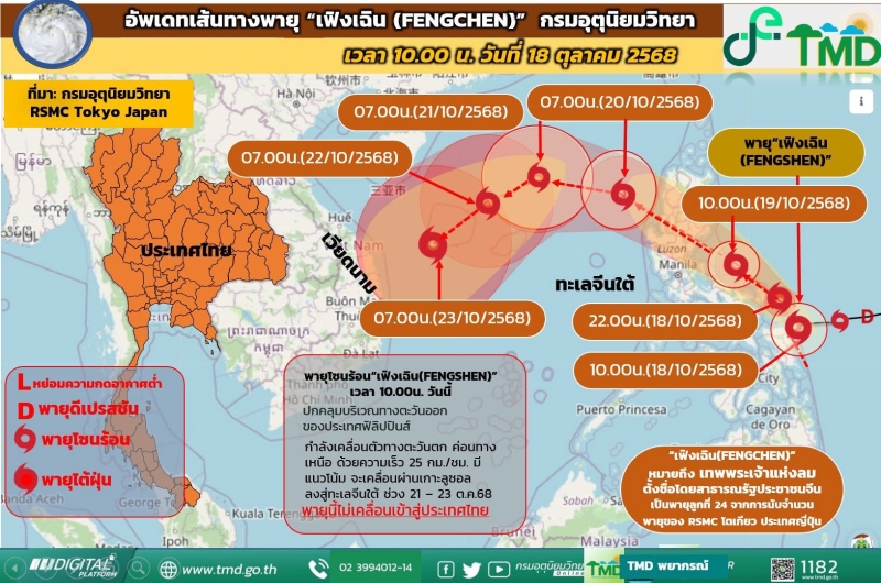 วันที่ 18 ต.ค. 68 กรมอุตุนิยมวิทยา อัพเดทเส้นทางพายุโซนร้อน เฟิงเฉิน (Fengchen) เมื่อเวลา 10.00 น. (18 ตุลาคม 2568) พายุโซนร้อน เฟิงเฉิน ก่อตัวอยู่บริเวณ ด้านตะวันออกของประเทศฟิลิปปินส์ คาดว่าจะเคลื่อนผ่าน เกาะลูซอน แล้วลงสู่ ทะเลจีนใต้ตอนบน