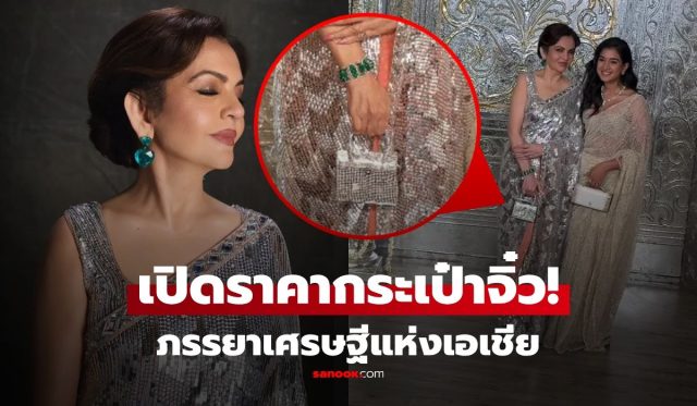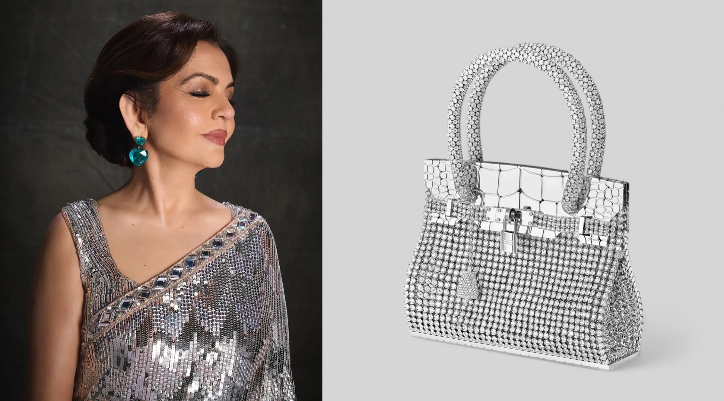 ในงาน นิตา อัมบานี สวมส่าหรีสีเงินประดับเลื่อมที่ออกแบบโดยมาฮอตรา ดีไซน์ที่เน้นรายละเอียดลูกศรคู่และความประณีตของการตกแต่งดูสง่างาม พร้อมกับรองเท้าส้นสูงสีเงิน การแต่งหน้าของเธอเรียบง่ายแต่โดดเด่นด้วยลิปสติกสีเนื้อ แต่งตาแบบธรรมชาติที่มีประกาย และรวบผมเรียบเนียนเพื่อบาลานซ์ลุคโดยรวมให้ดูน่าประทับใจ อย่างไรก็ตาม สิ่งที่ดึงดูดสายตามากที่สุดคือกระเป๋า Hermès รุ่นมินิ Birkin ที่เธอถืออยู่