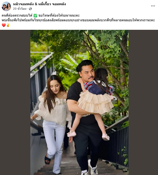 อย่างไรก็ตาม ล่าสุดภรรยาคนสวยของกัน จอมพลัง อย่าง หมิว อดีตนางงาม ได้ออกมาเคลื่อนไหวเป็นครั้งเเรกท่ามกลางดราม่าเดือดนี้ ด้วยการโพสต์ผ่านเฟซบุ๊กส่วนตัว หมิวจอมพลัง&หมี่เกี๊ยว จอมพลัง ซึ่งสร้างความฮือฮาในโลกออนไลน์ทันที โดยหมิวได้โพสต์ภาพครอบครัว สามคน พ่อ เเม่ และลูกสาวตัวน้อย พร้อมข้อความสั้น ๆ โดยระบุว่า คนดีต้องตรวจสอบได้ ขอโทษที่ต้องให้รอนานนะคะ พรุ่งนี้รอฟังไปพร้อมกันไขทุกข้อสงสัย พร้อมตอบทุกอย่าง ขอบคุณพลังบวกดี ๆ ที่หลายคนมอบให้พวกเรานะคะ