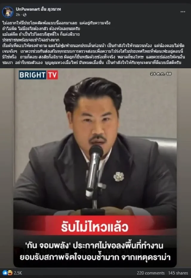 “อั๋น ภูวนาท” ฝากถึง “กัน จอมพลัง” — ขอแค่ตอบตรงคำถาม ไม่ต้องตัดพ้อ แนะอยู่กับความจริงและยืนหยัดด้วยข้อเท็จจริง เพื่อความโปร่งใสในสังคมไทย
