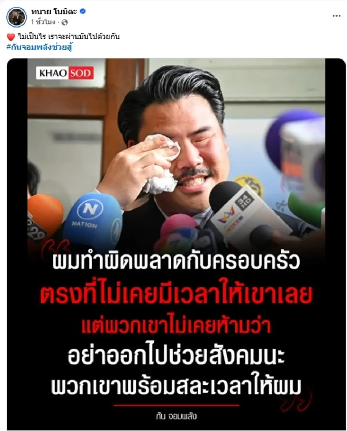 และโพสต์อีกครั้งว่า “ไม่เป็นไร เราจะผ่านมันไปด้วยกัน #กันจอมพลังช่วยสู้”