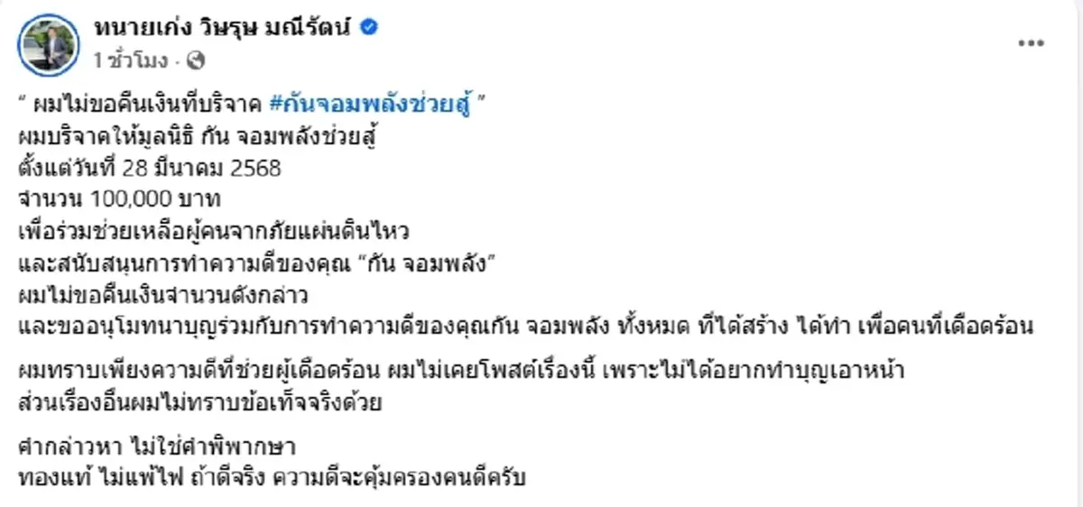 หวังเพียงให้พี่น้องประชาชนไทยได้รับประโยชน์สูงสุด ในส่วนเรื่องของมูลนิธิฯ นั้น เรายินดีให้ตรวจสอบ แต่หากตรวจสอบแล้วไม่พบความผิดใดๆ เราขอโอกาสให้เราได้ทำหน้าที่เพื่อช่วยเหลือ พี่น้องชาวไทยเฉกเช่นเดิมต่อไป
