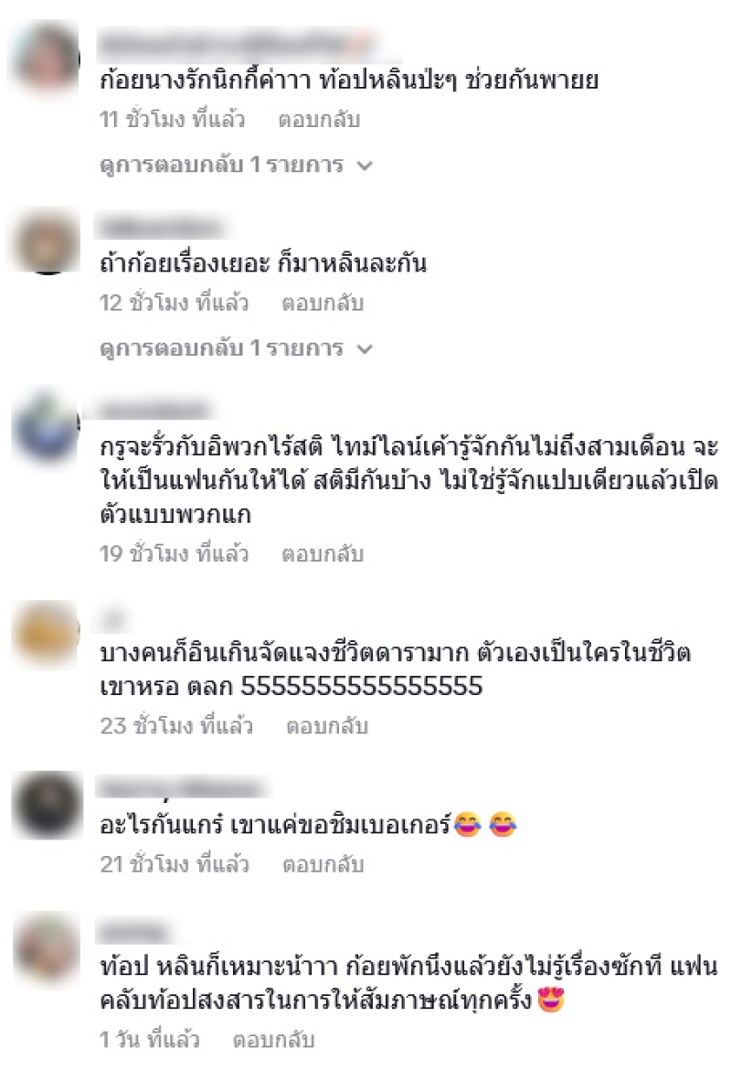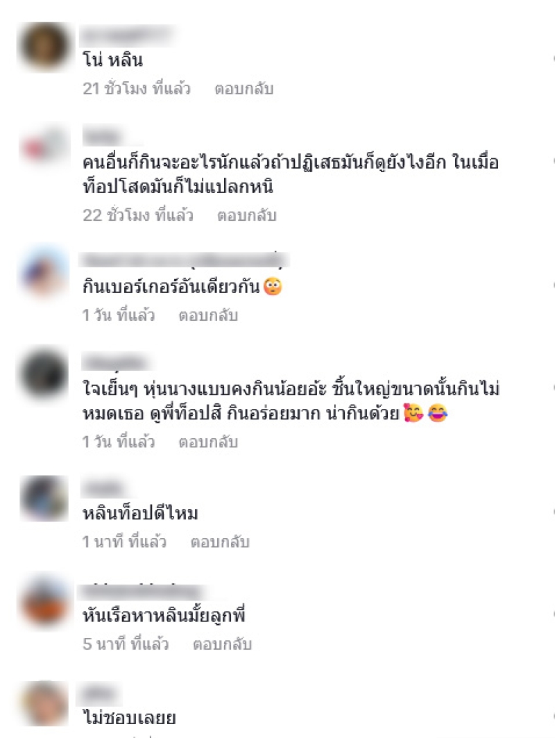 ท่ามกลางแฟนๆต่างแสดงความออกเป็น 2 ฝ่าย โดยคอมเมนต์กันอย่างมาก อาทิ เขากินหลายคนนะ แต่คลิปตัดมาแค่นี้ พี่โอ้ พี่เป้ ก็กินด้วยเบอร์เกอร์อันนี้อ่ะ,ท็อปหลินได้ม้ะ,ท๊อปก้อยไม่ค่อยอิน ท็อปหลินได้มั้ยอ่า,อยากกินทำไมไม่สั่งเอง?,มันดูไม่โอเคเลย แปลกๆ