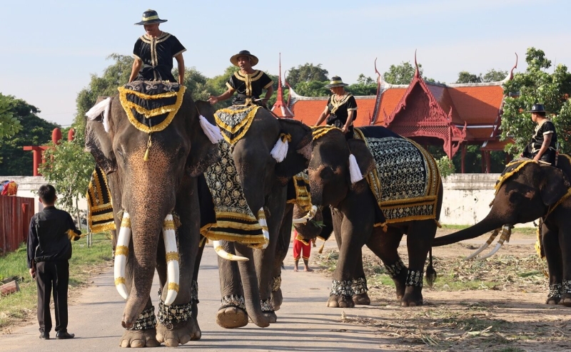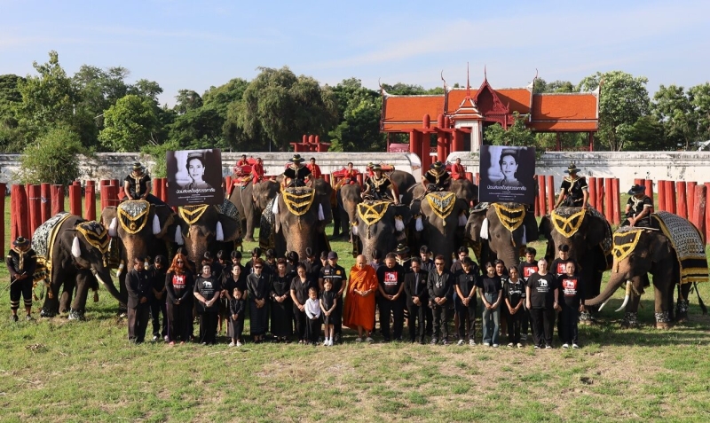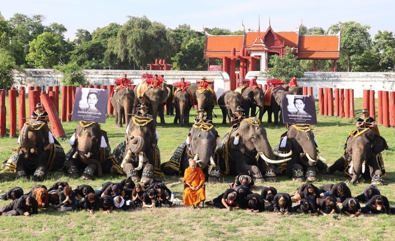 นายลายทองเหรียญ มีพันธ์ เจ้าของวังช้างอยุธยา แล เพนียด พร้อมด้วยผู้บริหาร พนักงาน ควาญช้าง เหล่าคชสาร รวมทั้งชาวบ้านตำบลสวนพริก หมู่บ้านช้างเพนียดหลวง พร้อมช้างอีก 9 เชือก ตกแต่งผ้าคลุมลวดลายขาวดำที่ตัวช้าง พวงมาลัยดอกไม้สีขาว และ มีพระบรมฉายาลักษณ์ สมเด็จพระนางเจ้าสิริกิติ์ พระบรมราชชนนีพันปีหลวง อยู่บนหลังช้าง