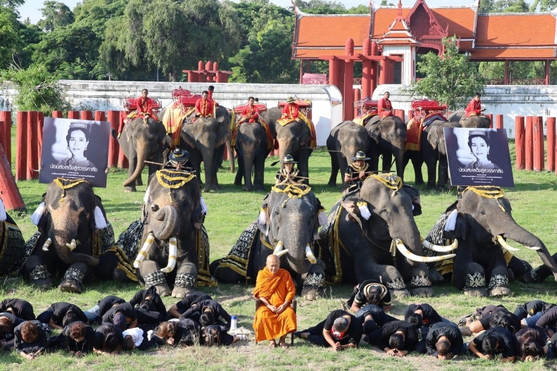 เผยภาพบรรยากาศ ควาญช้าง-ช้างกรุงเก่า ยืนสงบนิ่ง-หมอบกราบ ถวายความอาลัย พระพันปีหลวง