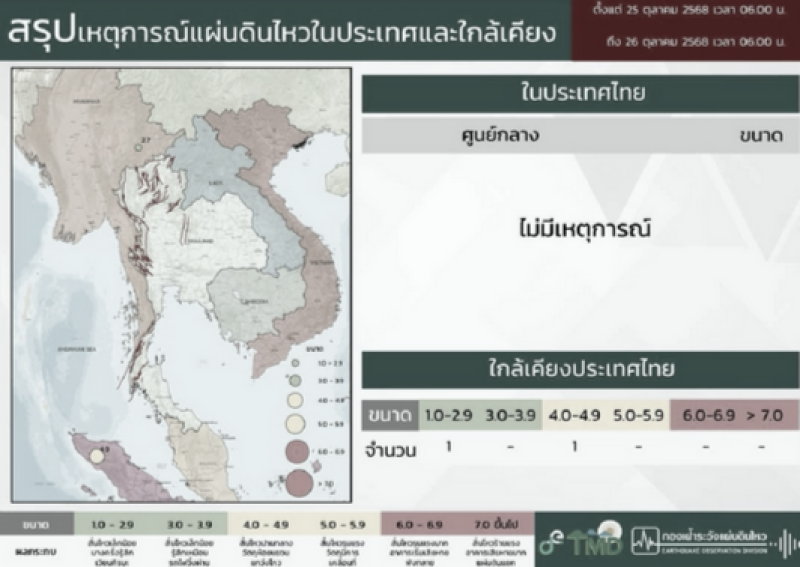 กองเฝ้าระวังแผ่นดินไหว กรมอุตุนิยมวิทยา ได้รายงานสถานการณ์แผ่นดินไหวที่เกิดขึ้นในช่วงวันที่ 25 – 26 ตุลาคม 2568 โดยตรวจพบเหตุการณ์สำคัญในพื้นที่ใกล้เคียงประเทศไทย 2 จุด