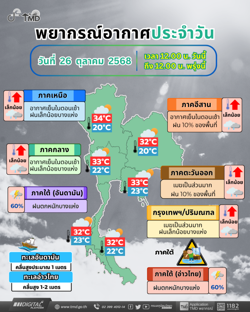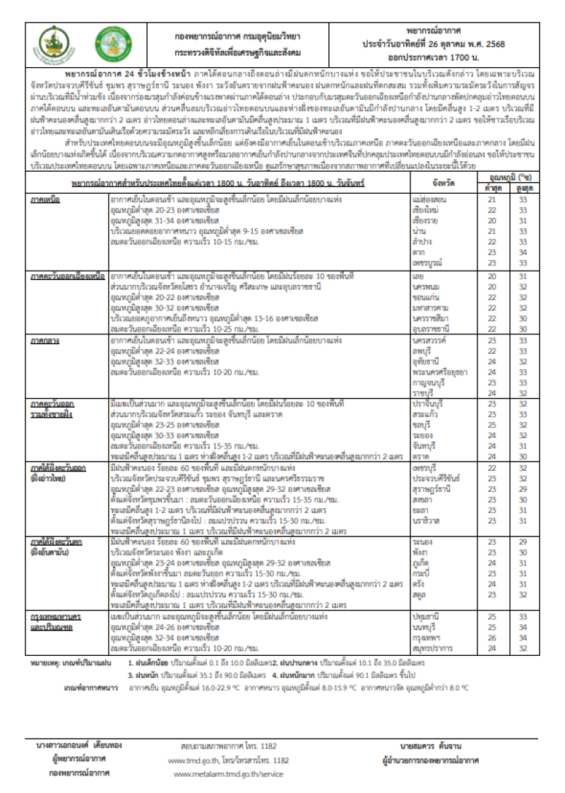 วันที่ 26 ตุลาคม 2568 กรมอุตุนิยมวิทยาได้พยากรณ์อากาศ 24 ชั่วโมงข้างหน้า ภาคใต้ตอนกลางถึงตอนล่างมีฝนตกหนักบางแห่ง ขอให้ประชาชนในบริเวณดังกล่าว โดยเฉพาะบริเวณจังหวัดประจวบคีรีขันธ์ ชุมพร สุราษฎร์ธานี ระนอง พังงา ระวังอันตรายจากฝนฟ้าคะนอง ฝนตกหนักและฝนที่ตกสะสม รวมทั้งเพิ่มความระมัดระวังในการสัญจรผ่านบริเวณที่มีน้ำท่วมขัง