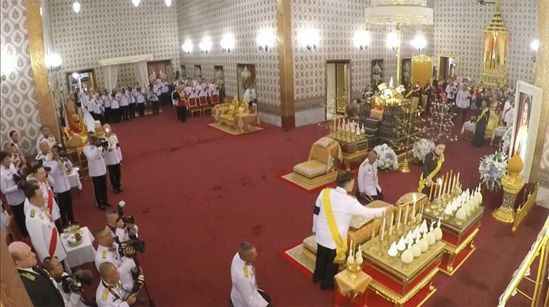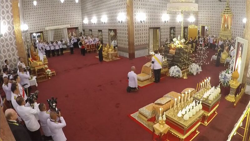 วันที่ 26 ต.ค. 2568 ที่พระนั่งดุสิตมหาสาท ในพระบรมมหาราชวัง พระบาทสมเด็จพระเจ้าอยู่หัว สมเด็จพระนางเจ้า ฯ พระบรมราชินี และพระบรมวงศานุวงศ์ ประทับยืนหน้าพระราชอาสน์ และหน้าพระเก้าอี้ ณ พระที่นั่งดุสิตมหาปราสาท (ทหารมหาดเล็กราชวัลลภรักษาพระองค์เชิญพระหีบพระบรมศพขึ้นประดิษฐานบนพระแท่นแว่นฟ้าทอง พระตำรวจหลวงคลุมผ้าเยียรบับบนพระหีบพระบรมศพ ทหารมหาดเล็กราชวัลลภรักษาพระองค์ คลุมพระหีบพระบรมศพด้วยธงสมเด็จพระบรมราชชนนีพันปีหลวงใหญ่ เสร็จแล้ว ทหารมหาดเล็กราชวัลลภรักษาพระองค์ กราบพระบรมศพ ทหารปืนใหญ่หยุดยิง)
