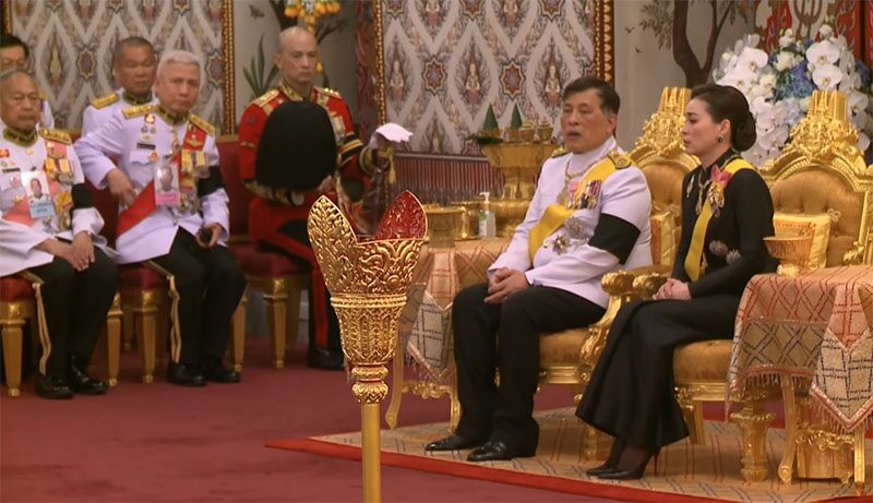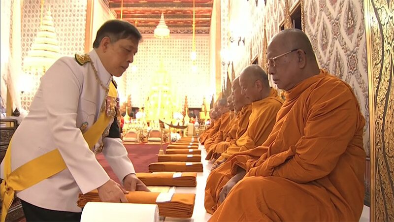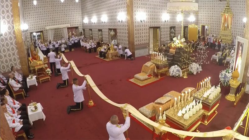 พระบาทสมเด็จพระเจ้าอยู่หัว เสด็จ ฯ ไปทรงทอดผ้าไตร ประทับพระราชอาสน์ (พระสงฆ์สดับปกรณ์)