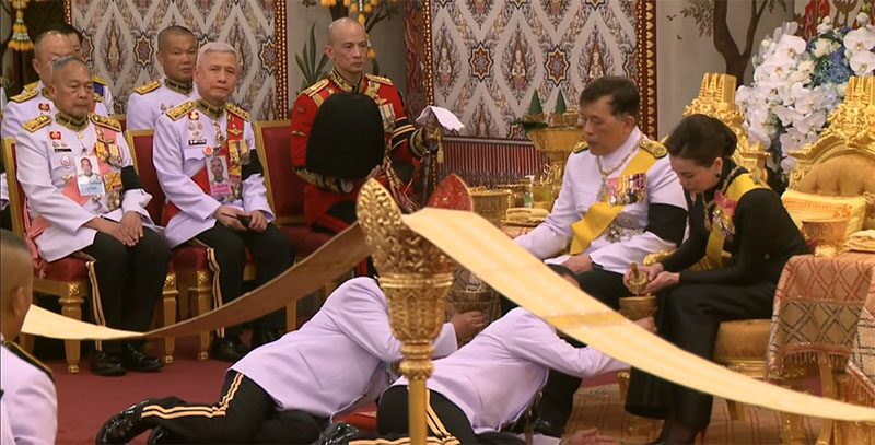 พระบาทสมเด็จพระเจ้าอยู่หัว และสมเด็จพระนางเจ้า ฯ พระบรมราชินี เสด็จออก พร้อมด้วยสมเด็จพระเจ้าลูกเธอ เจ้าฟ้าสิริวัณณวรี นารีรัตนราชกัญญา สมเด็จพระเจ้าลูกยาเธอ เจ้าฟ้าทีปังกรรัศมีโชติ มหาวชิโรตตมางกูร สิริวิบูลยราชกุมาร และเจ้าคุณพระสินีนาถ พิลาสกัลยาณี จากพระที่นั่งดุสิตมหาปราสาท ลงทางมุขกระสันพระที่นั่งพิมานรัตยา (โดยลิฟต์)