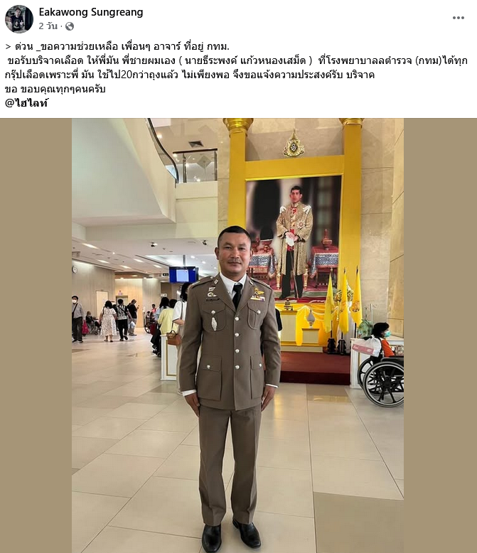 จากกรณีมีผู้ใช้เฟซบุ๊กชื่อ Eakawong Sungreang โพสต์ขอความช่วยเหลือให้เพื่อน ๆ และอาจารย์ในกรุงเทพฯ ร่วมบริจาคเลือดให้พี่ชาย คือ พ.ต.ต.ธีระพงค์ แก้วหนองเสม็ด หรือ สารวัตรมัน อดีตนักมวยชื่อดัง เจ้าของฉายาในวงการมวย ธีรพงษ์ ไดสตาร์ยิม อดีตแชมป์ IBF Pan Pacific รุ่นแบนตัมเวต ช่วงปี 2546-2549 ซึ่งเป็นที่จดจำจากประวัติการชกอันยาวนาน และการป้องกันแชมป์หลายครั้ง ขณะนี้เข้ารับการรักษาตัวอยู่ที่โรงพยาบาลตำรวจ ตามที่ได้รายงานไปนั้น