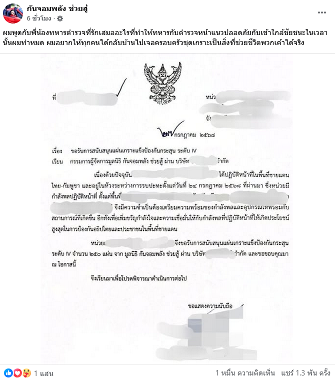 ล่าสุด เมื่อวันที่ 31 ตุลาคม 2568 กัน จอมพลัง ได้โพสต์รูปภาพหนังสือราชการ พร้อมข้อความผ่านเพจเฟซบุ๊ก กันจอมพลัง ช่วยสู้ โดยระบุว่า ผมพูดกับพี่น้องทหารตำรวจที่รักเสมอ อะไรที่ทำให้ทหารกับตำรวจหน้าแนวปลอดภัย กับเข้าใกล้ชัยชนะในเวลานั้น ผมทำหมด ผมอยากให้ทุกคนได้กลับบ้านไปเจอครอบครัว ชุดเกราะเป็นสิ่งที่ช่วยชีวิตพวกเขาได้จริง