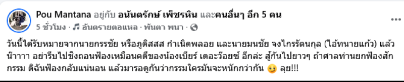ล่าสุด ปู มัณฑนา ได้รับหมายศาลจาก หนุ่ม กรรชัย พร้อมเขียนแคปชั่นว่า วันนี้ได้รับหมายจากนายกรรชัย หรือภูดิสสส กำเนิดพลอย และนายมนชัย จงไกรรัตนกุล (แก้ว) แล้วน๊าาาา อย่ารีบไปชิงถอนฟ้องเหมือนน้องเบียร์ เดอะว๊อยซ์ อีกล่ะ สู้กันไปยาวๆ ถ้าศาลท่านยกฟ้องสักกรรม ดิฉันฟ้องกลับแน่นอน แล้วมารอดูกันว่ากรรมใครมันจะหนักกว่ากัน