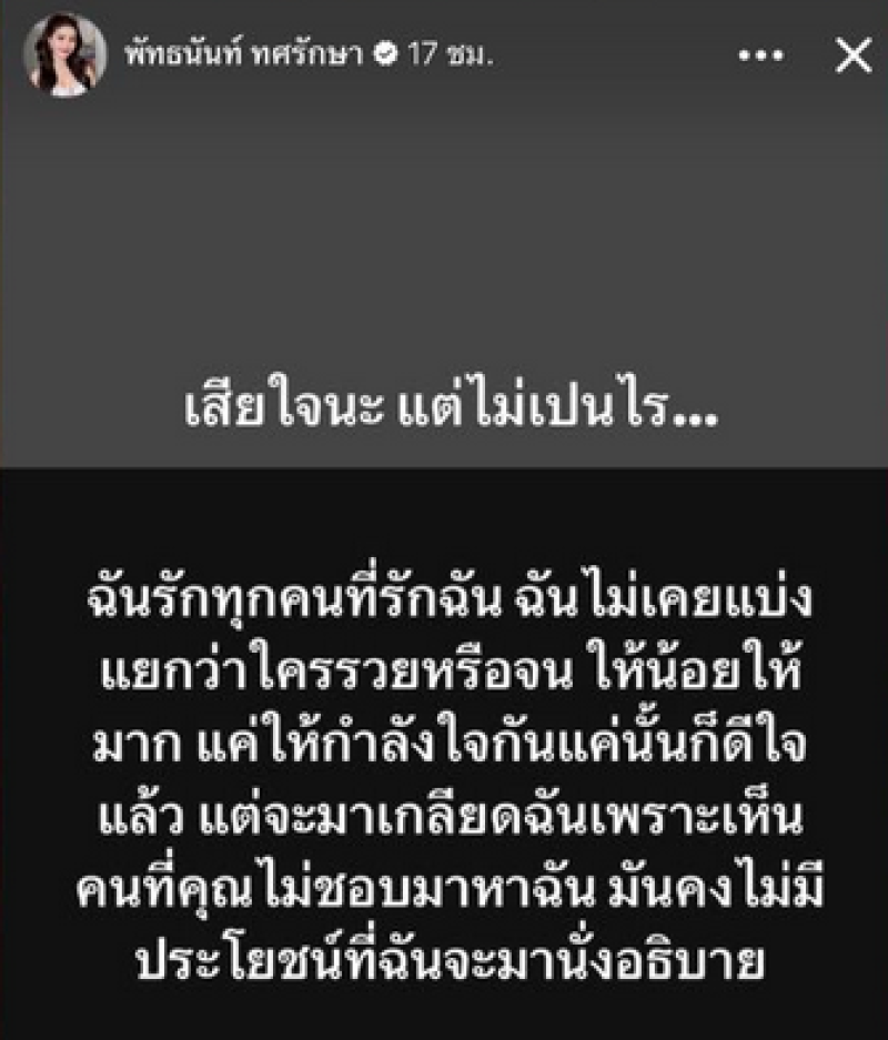 ฉันรักทุกคนที่รักฉัน ฉันไม่เคยแบ่ง แยกว่าใครรวยหรือจน ให้น้อยให้ มาก แค่ให้กำลังใจกันแค่นั้นก็ดีใจ แล้ว แต่จะมาเกลียดฉันเพราะเห็น คนที่คุณไม่ชอบมาหาฉัน มันคงไม่มี ประโยชน์ที่ฉันจะมานั่งอธิบาย