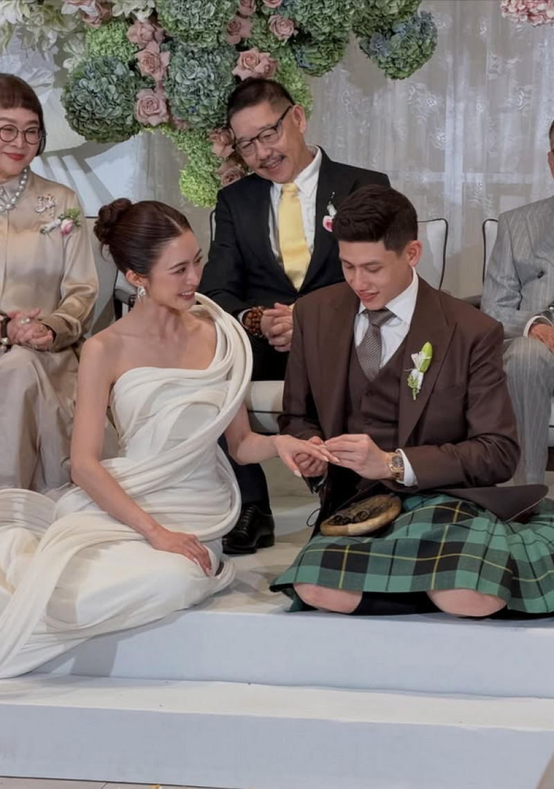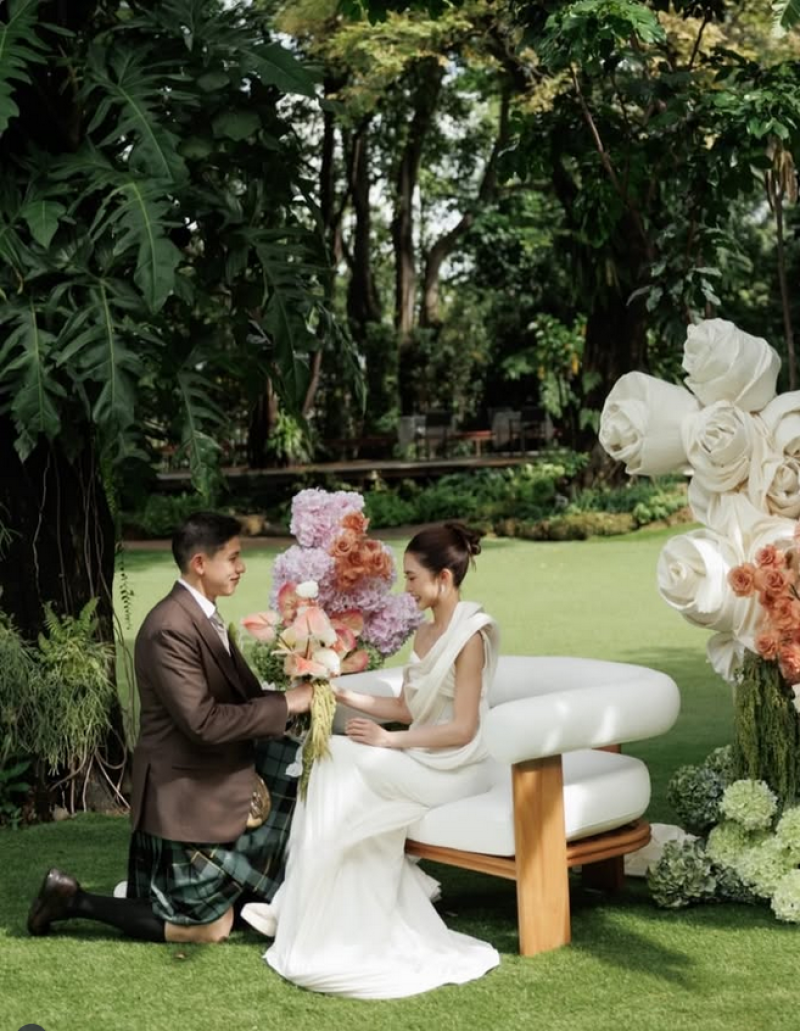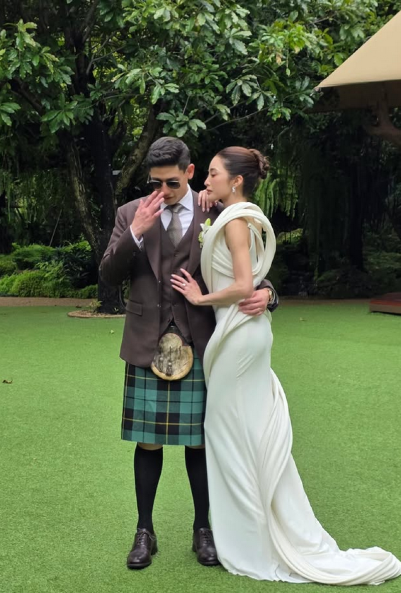 ส่วนเจ้าบ่าว พาย สุนิษฐ์ ก็ดูเท่และมีเอกลักษณ์ไม่แพ้กันในชุดสูทเข้ารูปคู่กับ กระโปรงลายสก็อต (Kilt) อันเป็นชุดประจำชาติของสก็อตแลนด์ เพื่อสื่อถึงรากวัฒนธรรมฝั่งพ่อที่มีเชื้อสายสก็อต