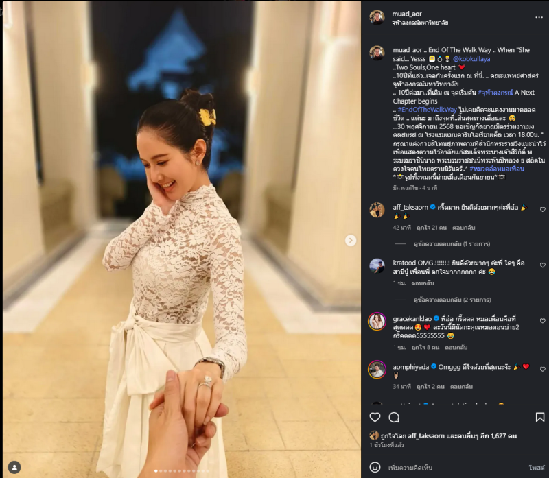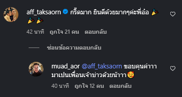 ท่ามกลางคอมเมนต์สุดยินดีโดยเฉพาะเพื่อนๆคนบันเทิงคนดัง ร่วมไปถึง แอฟ ทักษอร ที่เข้ามาแสดงความคิดเห็นว่า กรี๊ดมาก ยินดีด้วยมากๆค่ะพี่อ๋อ ซึ่งหมวดอ๋อ ตอบกลับด้วยว่า ขอบคุนค่าาา มาเปนเพื่อนเจ้าบ่าวด้วยน้าาา