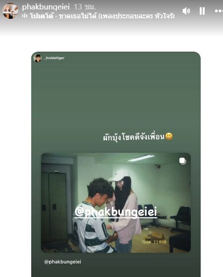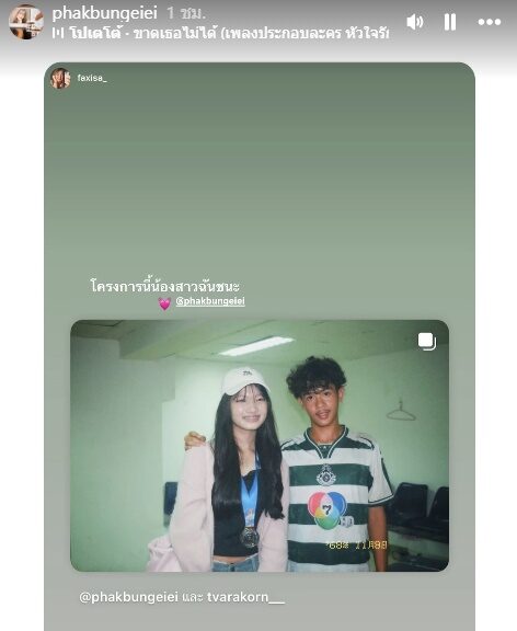 โดยน้องผักบุ้งยังโพสต์บรรยากาศนั่งเชียร์ เต และทีมหมอนทองฯ อยู่ข้างสนามท่ามกลางผู้คนล้นสนาม และยังแชร์สตอรี่ของเพื่อนๆที่แชร์โพสต์ของเจ้าตัวพร้อมแซวกันน่ารักมากๆ ว่าผู้ชนะเลิศครั้งนี้คือ น้องผักบุ้งด้วย
