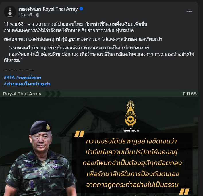 วันที่ 11 พฤศจิกายน 2568 เพจเฟซบุ๊ก กองทัพบก Royal Thai Army ได้โพสต์ข้อความระบุว่า จากสถานการณ์ชายแดนไทย–กัมพูชาที่มีความตึงเครียดเพิ่มขึ้น ภายหลังเหตุการณ์ที่มีกำลังพลได้รับบาดเจ็บจากการเหยียบทุ่นระเบิด พลเอก พนา แคล้วปลอดทุกข์ ผู้บัญชาการทหารบก ได้แสดงจุดยืนของกองทัพบกว่า