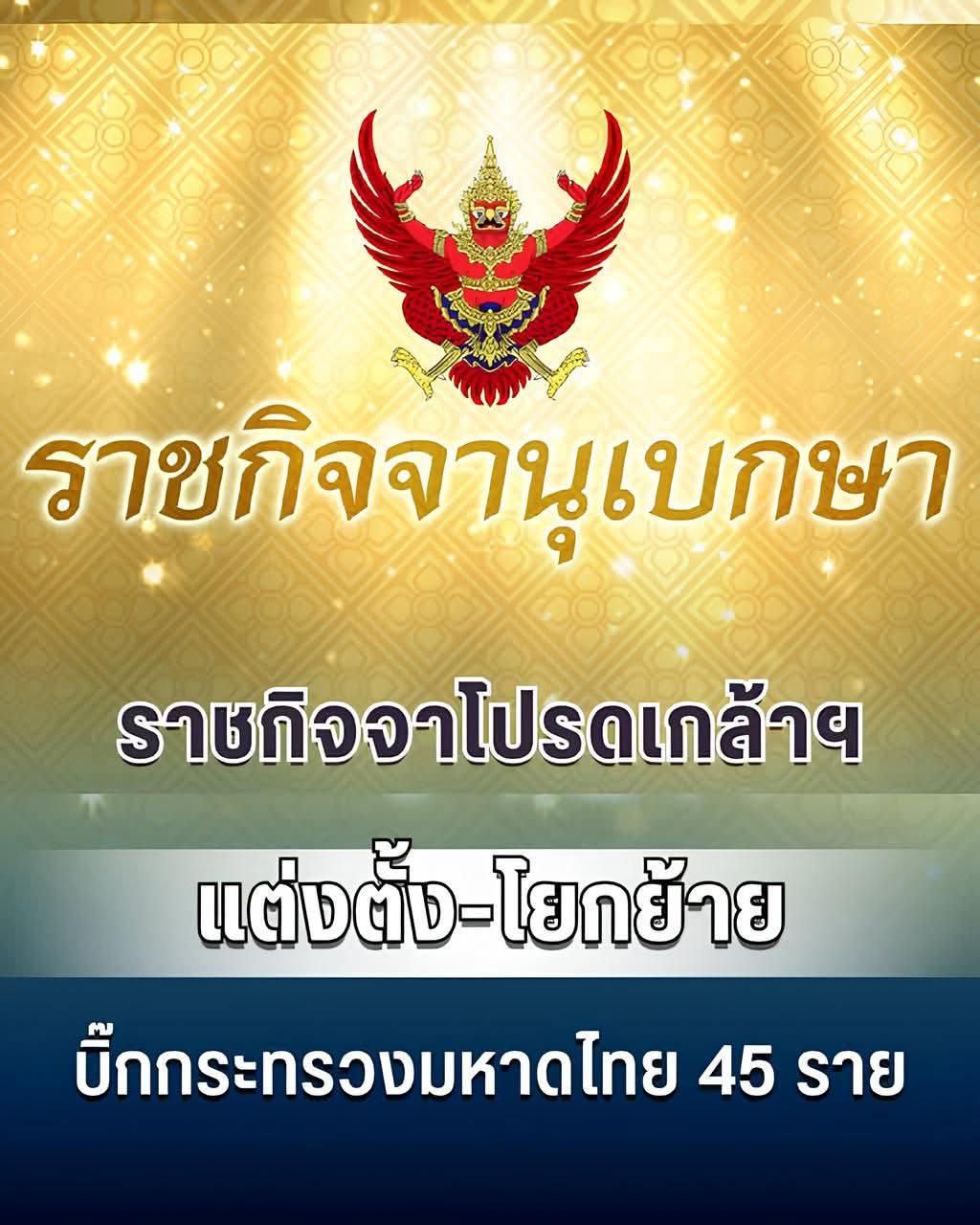 เมื่อวันที่ 13 พฤศจิกายน 2568 ราชกิจจานุเบกษา เผยแพร่ ประกาศสำนักนายกรัฐมนตรี เรื่อง แต่งตั้งข้าราชการพลเรือนสามัญ โดยมีพระบรมราชโองการโปรดเกล้าโปรดกระหม่อมให้ข้าราชการพลเรือนสามัญ สังกัดกระทรวงมหาดไทย พ้นจากตำแหน่ง และแต่งตั้งให้ดำรงตำแหน่งประเภทบริหารระดับสูง จำนวน 45 ราย ดังนี้