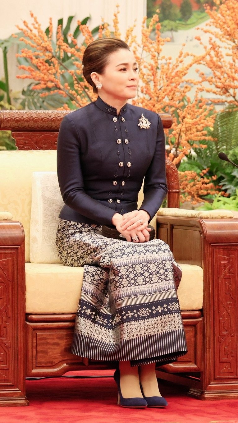 สมเด็จพระนางเจ้าฯ พระบรมราชินี ทรงสง่างามในฉลองพระองค์ชุดไทยพระราชนิยม โดยนำชุดไทยอมรินทร์มาประยุกต์กับกระดุมคู่ตามแบบชุดของจีน ในพิธีรับเสด็จอย่างเป็นทางการ ณ มหาศาลาประชาชน กรุงปักกิ่ง ในโอกาสที่ พระบาทสมเด็จพระเจ้าอยู่หัว และสมเด็จพระนางเจ้าฯ พระบรมราชินี เสด็จฯ เยือนประเทศจีน ตามคำทูลเชิญของประธานาธิบดีจีน