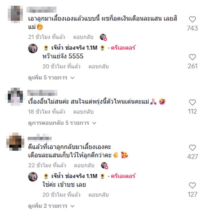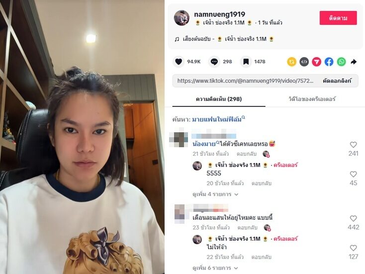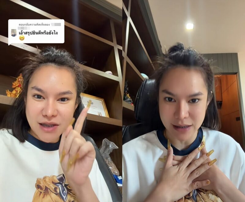 พร้อมทั้งตอบคนที่มาถามเรื่องที่ยังให้เงินอดีตสามีเดือนละแสนด้วยว่า “เดือนละแสนให้อยู่ไหมคะ แบบนี้” แม่น้ำหนึ่ง ก็ตอบชัดว่า “ไม่ให้จ้า”