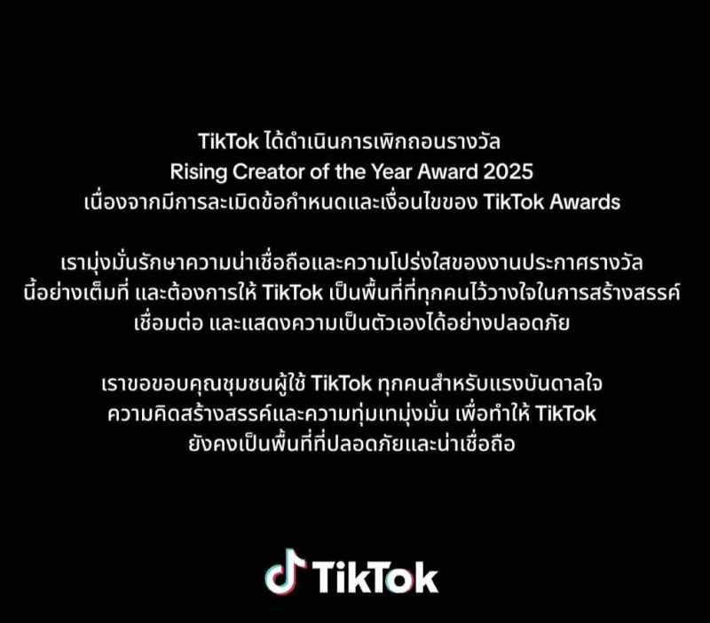 โดย TikTok ชี้แจงว่า การตัดสินใจครั้งนี้ เกิดจากการพบพฤติกรรมที่ขัดต่อข้อกำหนดของงานประกาศรางวัล ทางแพลตฟอร์มให้ความสำคัญกับความโปร่งใส มาตรฐาน และความเชื่อมั่นของผู้ใช้งานเป็นอันดับแรก จึงจำเป็นต้องดำเนินการ เพื่อรักษาความน่าเชื่อถือของเวทีรางวัลในระยะยาว