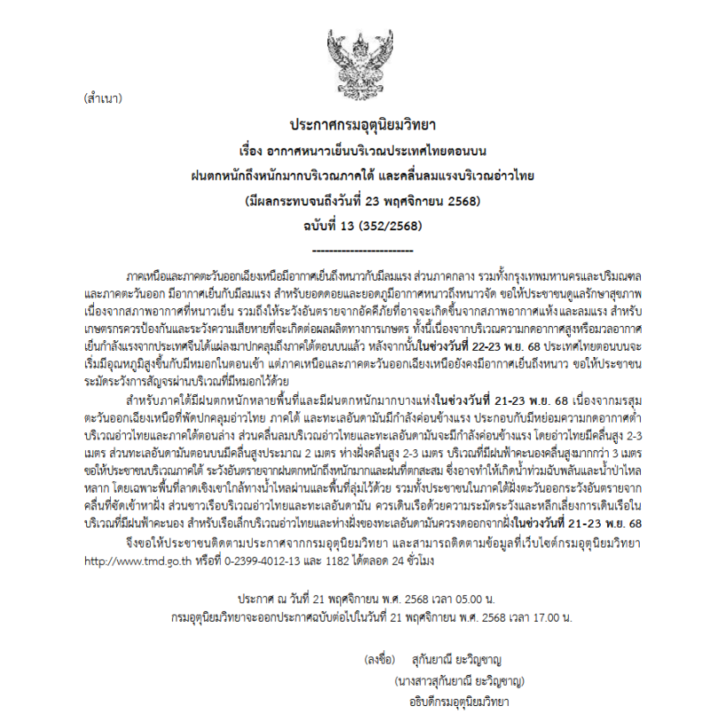 ประกาศกรมอุตุนิยมวิทยา เรื่อง อากาศหนาวเย็นบริเวณประเทศไทยตอนบน ฝนตกหนักถึงหนักมากบริเวณภาคใต้ และคลื่นลมแรงบริเวณอ่าวไทย (มีผลกระทบจนถึงวันที่ 23 พฤศจิกายน 2568) ฉบับที่ 13 (352/2568)