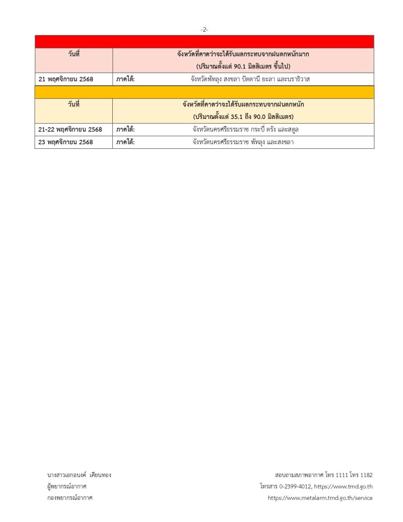 สำหรับภาคใต้มีฝนตกหนักหลายพื้นที่และมีฝนตกหนักมากบางแห่งในช่วงวันที่ 21-23 พ.ย. 68 เนื่องจากมรสุมตะวันออกเฉียงเหนือที่พัดปกคลุมอ่าวไทย ภาคใต้ และทะเลอันดามันมีกำลังค่อนข้างแรง ประกอบกับมีหย่อมความกดอากาศต่ำบริเวณอ่าวไทยและภาคใต้ตอนล่าง ส่วนคลื่นลมบริเวณอ่าวไทยและทะเลอันดามันจะมีกำลังค่อนข้างแรง โดยอ่าวไทยมีคลื่นสูง 2-3 เมตร ส่วนทะเลอันดามันตอนบนมีคลื่นสูงประมาณ 2 เมตร ห่างฝั่งคลื่นสูง 2-3 เมตร บริเวณที่มีฝนฟ้าคะนองคลื่นสูงมากกว่า 3 เมตร ขอให้ประชาชนบริเวณภาคใต้ ระวังอันตรายจากฝนตกหนักถึงหนักมากและฝนที่ตกสะสม ซึ่งอาจทำให้เกิดน้ำท่วมฉับพลันและน้ำป่าไหลหลาก โดยเฉพาะพื้นที่ลาดเชิงเขาใกล้ทางน้ำไหลผ่านและพื้นที่ลุ่มไว้ด้วย รวมทั้งประชาชนในภาคใต้ฝั่งตะวันออกระวังอันตรายจากคลื่นที่ซัดเข้าหาฝั่ง ส่วนชาวเรือบริเวณอ่าวไทยและทะเลอันดามัน ควรเดินเรือด้วยความระมัดระวังและหลีกเลี่ยงการเดินเรือในบริเวณที่มีฝนฟ้าคะนอง สำหรับเรือเล็กบริเวณอ่าวไทยและห่างฝั่งของทะเลอันดามันควรงดออกจากฝั่งในช่วงวันที่ 21-23 พ.ย. 68