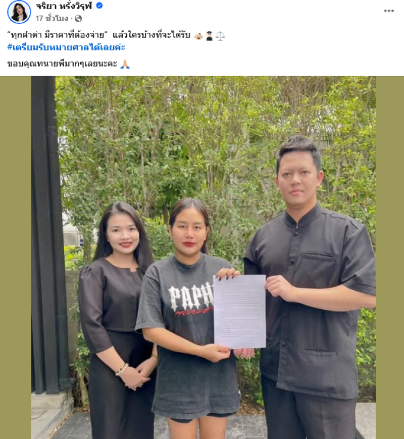 ล่าสุดเมื่อวันที่ 21 พ.ย. 68 ทางด้าน แตงโม ภรรยาของ แจ็ก แปปโฮ ได้ออกมาโพสต์ภาพหมายศาลพร้อมกับทนาย พร้อมเขียนแคปชั่นระบุว่า ทุกคำด่า มีราคาที่ต้องจ่าย แล้วใครบ้างที่จะได้รับ #เตรียมรับหมายศาลได้เลยค่ะ ขอบคุณทนายพีมากๆเลยนะคะ