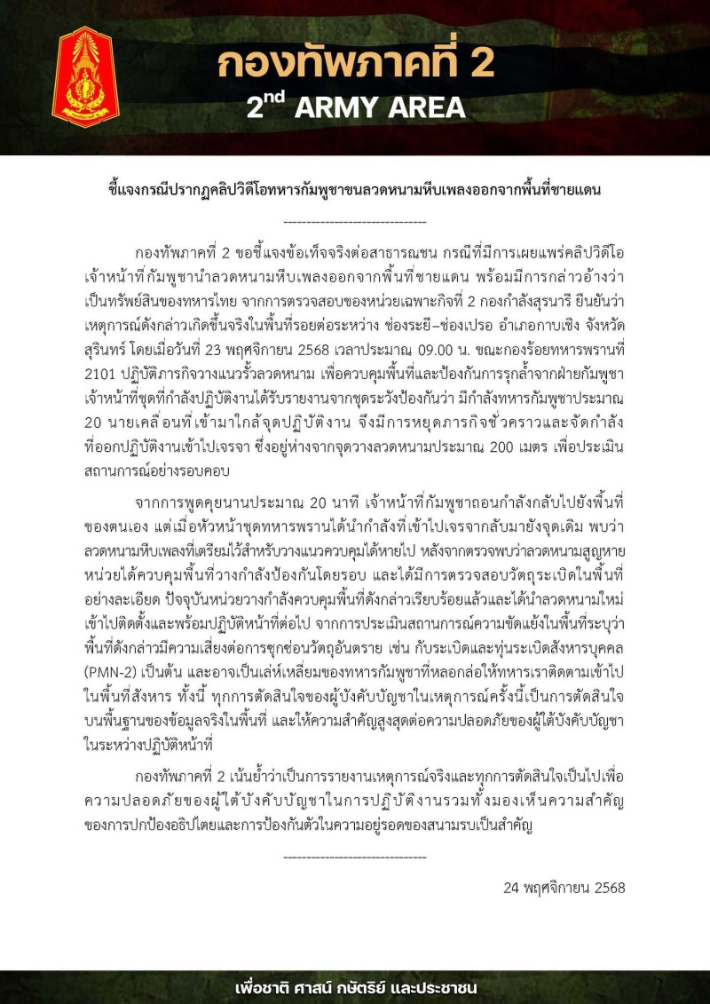 กองทัพภาคที่ 2 ขอชี้แจงข้อเท็จจริงต่อสาธารณชน กรณีที่มีการเผยแพร่คลิปวิดีโอเจ้าหน้าที่กัมพูชานำลวดหนามหีบเพลงออกจากพื้นที่ชายแดน พร้อมมีการกล่าวอ้างว่าเป็นทรัพย์สินของทหารไทย จากการตรวจสอบของหน่วยเฉพาะกิจที่ 2 กองกำลังสุรนารี ยืนยันว่าเหตุการณ์ดังกล่าวเกิดขึ้นจริง ในพื้นที่รอยต่อระหว่าง ช่องระยี – ช่องเปรอ อำเภอกาบเชิง จังหวัดสุรินทร์