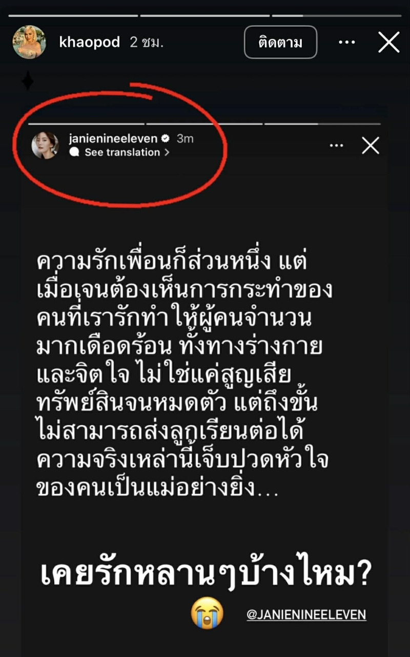 ในข้อความของเธอ เจนี่ เผยถึงความเสียหายที่เกิดขึ้นกับหลายคน ทั้งร่างกาย จิตใจ และทรัพย์สินที่สูญเสียจนแทบหมด พร้อมระบุว่า ผลกระทบครั้งนี้ ยังลามไปถึงการศึกษาของลูก ทำให้เห็นถึงความเจ็บปวดอย่างที่สุดในฐานะแม่