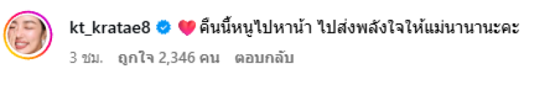 ด้าน กระแต ได้เข้ามาคอมเมนต์ให้กำลังใจทันที โดยระบุว่า คืนนี้หนูไปหาน้า ไปส่งพลังใจให้ แม่นานา นะคะ สะท้อนว่ายังคงอยู่เคียงข้างและพร้อมสนับสนุนในช่วงเวลายากลำบากของนานา