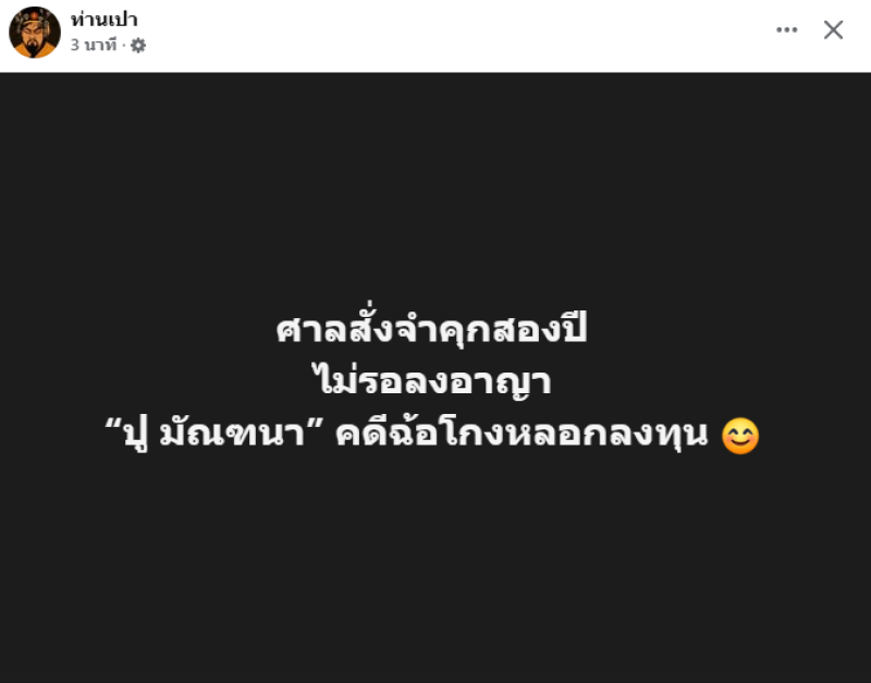 วันที่ 25 พฤศจิกายน 2568 เพจดัง ท่านเปา ได้เผยแพร่โพสต์ระบุว่า ศาลมีคำสั่งให้ลงโทษจำคุก ปู มัณฑนา เป็นเวลา 2 ปี โดยไม่รอลงอาญา จากคดีฉ้อโกงหลอกลงทุน ซึ่งเป็นคดีที่ถูกติดตามอย่างต่อเนื่องในโลกออนไลน์ก่อนหน้านี้