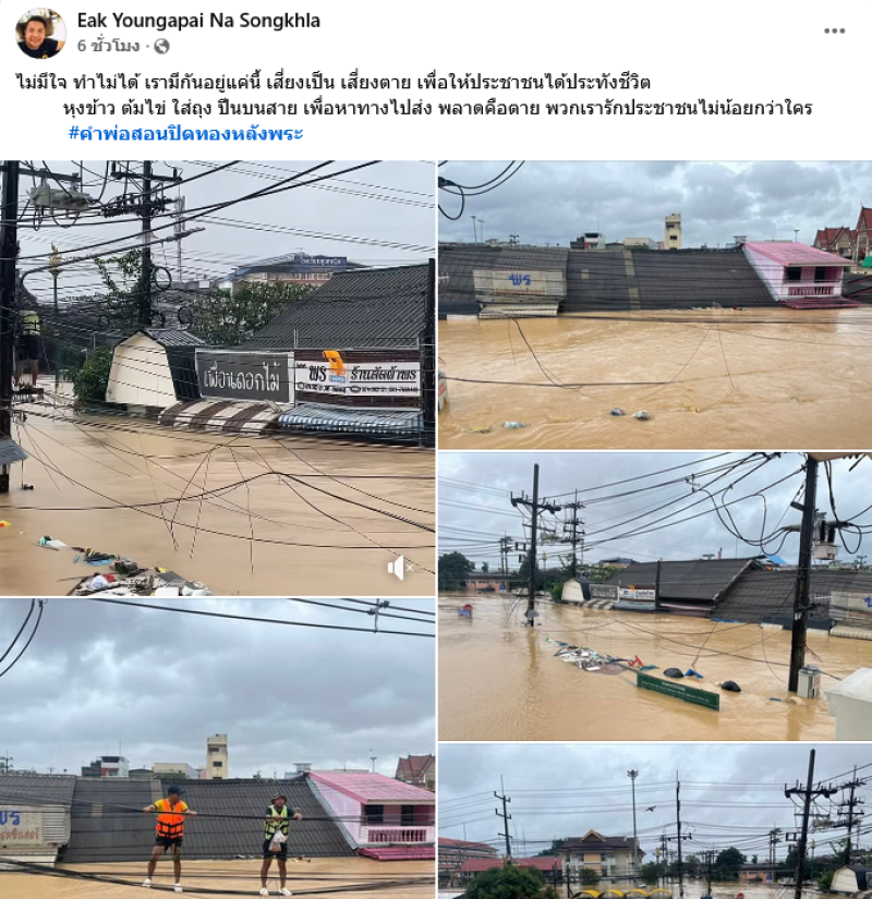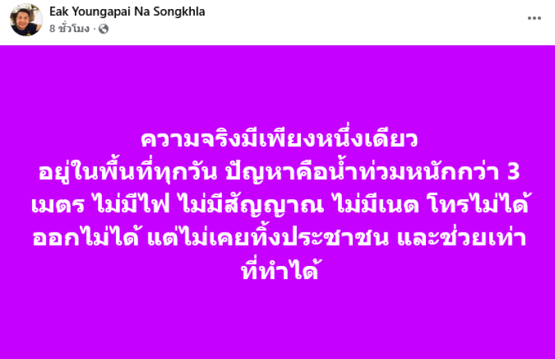 ล่าสุด นายเอก ยังอภัย ณ สงขลา นายอำเภอหาดใหญ่ ได้มีการโพสต์เคลื่อนไหวระบุว่า ความจริงมีเพียงหนึ่งเดียว อยู่ในพื้นที่ทุกวัน ปัญหาคือน้ำท่วมหนักกว่า 3 เมตร ไม่มีไฟ ไม่มีสัญญาณ ไม่มีเน็ต โทรไม่ได้ ออกไม่ได้ แต่ไม่เคยทิ้งประชาชน และช่วยเท่าที่ทำได้