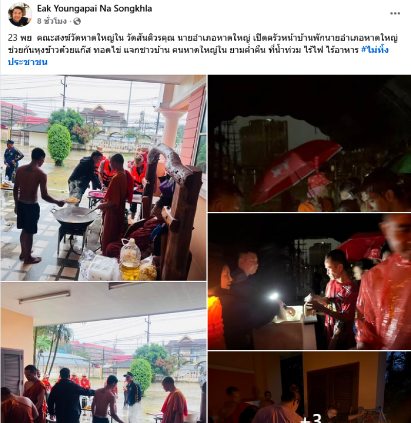 ต่อมาได้โพสต์ภาพช่วยน้ำท่วมระบุว่า คณะสงฆ์วัดหาดใหญ่ใน วัดสันติวรคุณ นายอำเภอหาดใหญ่ เปิดครัวหน้าบ้านพักนายอำเภอหาดใหญ่ ช่วยกันหุงข้าวด้วยแก๊ส ทอดไข่ แจกชาวบ้าน คนหาดใหญ่ใน ยามค่ำคืน ที่น้ำท่วม ไร้ไฟ ไร้อาหาร #ไม่ทิ้งประชาชน