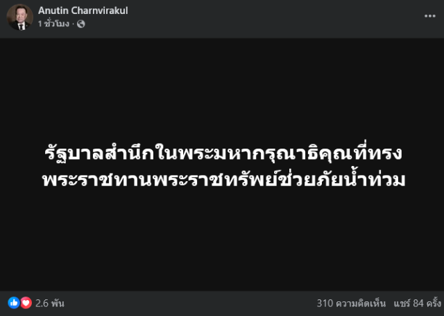 ล่าสุด นายอนุทิน ชาญวีรกูล ได้โพสต์ข้อความ ผ่านเฟซบุ๊กส่วนตัว Anutin Charnvirakul โดยระบุว่า รัฐบาลสำนึกในพระมหากรุณาธิคุณที่ทรงพระราชทานพระราชทรัพย์ช่วยภัยน้ำท่วม