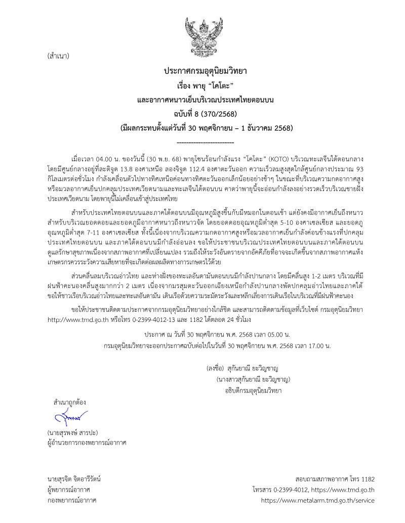 เมื่อวันที่ 30 พฤศจิกายน 2568 เว็บไซต์ กรมอุตุนิยมวิทยา เผยเเพร่ ประกาศกรมอุตุนิยมวิทยา เรื่อง พายุ โคโตะ และอากาศหนาวเย็นบริเวณประเทศไทยตอนบน ฉบับที่ 8 (370/2568) (มีผลกระทบตั้งแต่วันที่ 30 พฤศจิกายน – 1 ธันวาคม 2568)