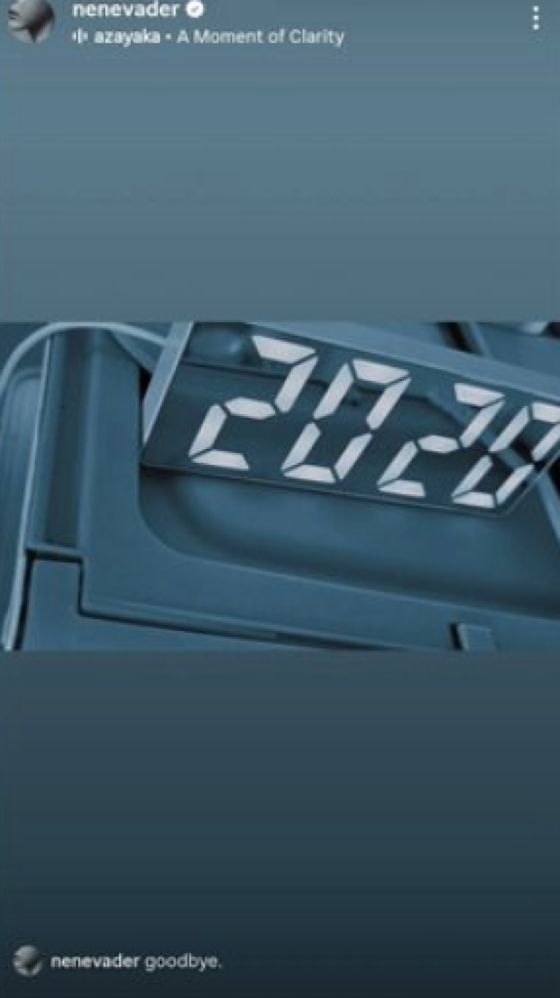 ถัดมาเธอยังได้ลงสตอรี่ภาพนาฬิกาที่ปรากฏตัวเลข 20:20 พร้อมคำว่า goodbye ซึ่งแปลว่า ลาก่อน ทำให้แฟน ๆ จำนวนมากส่งกำลังใจและความห่วงใยต่อสภาพจิตใจของเธออย่างต่อเนื่อง
