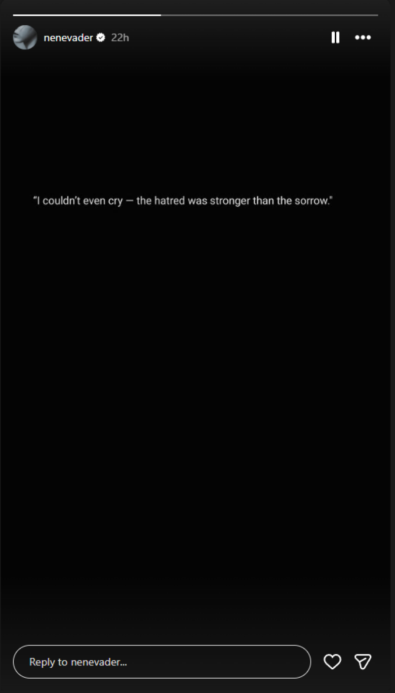 ต่อจากนั้น เนเน่ พรนับพัน ได้เคลื่อนไหวผ่านอินสตาแกรมส่วนตัวชื่อ @Nenevader โดยโพสต์ไอจีสตอรี่โทนเศร้าด้วยพื้นหลังสีดำ พร้อมข้อความว่า I couldnot even cry – the hatred was stronger than the sorrow. ซึ่งมีความหมายว่า ฉันถึงกับร้องไห้ไม่ออกเลย ความเกลียดชังมันรุนแรงกว่าความโศกเศร้าเสียอีก