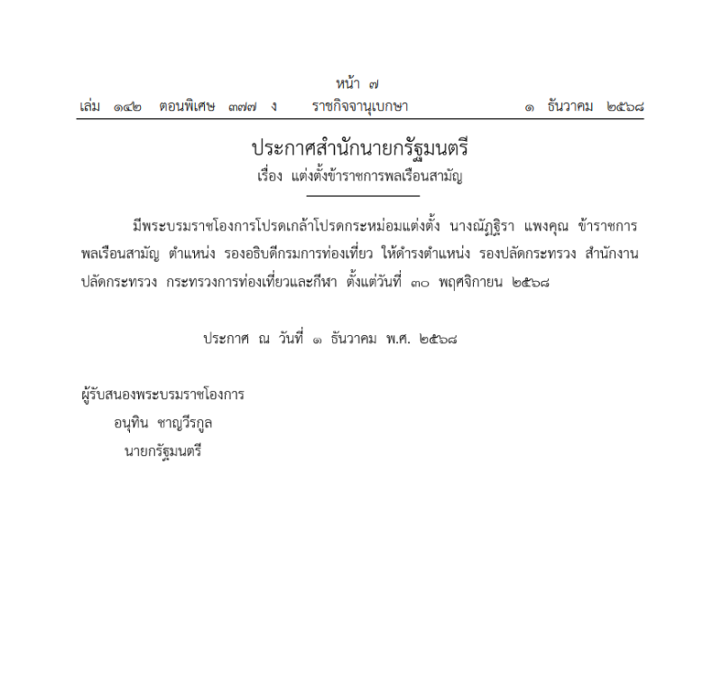 เมื่อวันที่ 1 ธันวาคม 2568 ที่ผ่านมา เว็บไซต์ ราชกิจจานุเบกษา เผยเเพร่ ประกาศสำนักนายกรัฐมนตรี เรื่อง แต่งตั้งข้าราชการพลเรือนสามัญ มีพระบรมราชโองการโปรดเกล้าโปรดกระหม่อมแต่งตั้ง นางณัฏธิรา แพงคุณ ข้าราชการ พลเรือนสามัญ ตำแหน่ง รองอธิบดีกรมการท่องเที่ยว ให้ดำรงตำแหน่ง รองปลัดกระทรวง สำนักงานปลัดกระทรวง กระทรวงการท่องเที่ยวและกีฬา ตั้งแต่วันที่ 30 พฤศจิกายน 2568